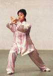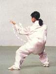 (12)重心后移,上体右转,左脚再向左前方上一步;左掌屈肘内旋向左、向后划平弧,而后左掌翘腕至左肩前上方,掌心斜向上;右掌随之划弧后收于右腰际;目视前方。 |